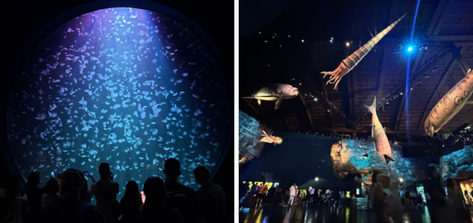 展示は“見るだけ”ではなく、生命の誕生や進化の歴史をたどる構成。海の始まりから未来までをめぐる、まるで海中旅行のような体験ができます。入口すぐの「In the Beginning」では、5億年以上変わらぬ姿を持つクラゲや古代生物を紹介。他にも、サメを間近で見られる「Shark Seas」や、巨大水槽が広がる「Open Ocean」など見どころが満載です。広い館内なので、所要時間は3~4時間ほどが目安です。