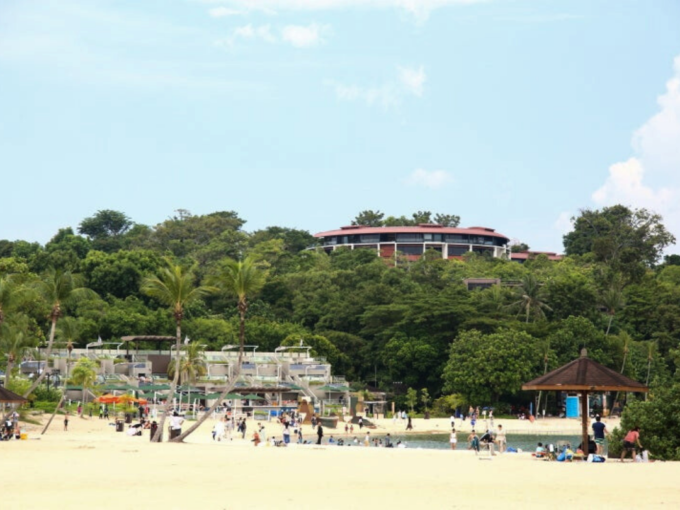 セントーサ島にはビーチもあり、モノレールで移動して散策へ。海の透明度は高くありませんが、多くの人でにぎわっており、ビーチ沿いにはレストランも点在しています。
