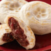 梅ヶ枝餅は薄い餅生地でつぶあんをくるみ、梅の刻印が入った鉄板で焼く焼餅です。出来たての梅ヶ枝餅は餅生地がパリっと芳ばしく、中はもっちりしていて、一度食べるとやみつきになること間違いなし。